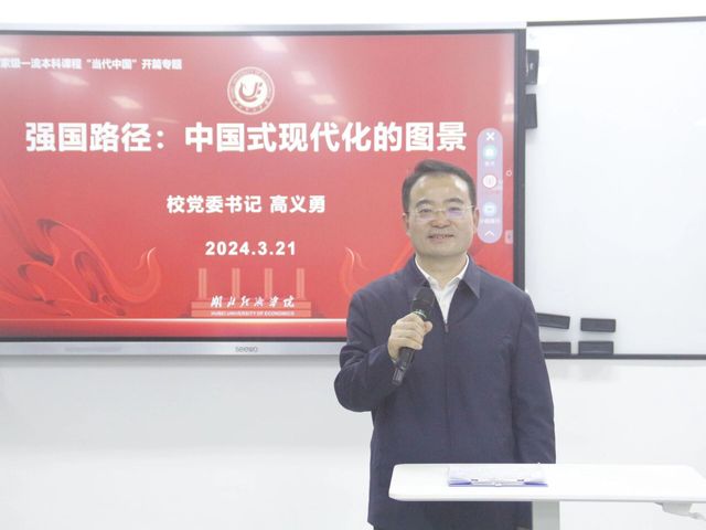 时代总是把历史责任赋予青年,推进中国式现代化是一项前无古人的开创性事业。高书记用"我眼中的大学思政课要干什么?中国式的现代化是怎样的一个历史进程?青年与中国现代化历史进程的关系是什么?湖经的员工能够为这个历史进程做些什么?"四个问题破题,结合自身的成长经历,用丰富的历史资料和鲜活的现实案例,带领师生回顾了中国式现代化的艰辛历程和辉煌成就。从工业、农业、国防和科学技术的现代化实践,到温饱、小康、比较富裕的现代化发展阶段,再到如今以人民为中心,追求全体人民共同富裕的新时代目标,高书记的讲述如一幅波澜壮阔的历史画卷,在同学们的面前徐徐展开。