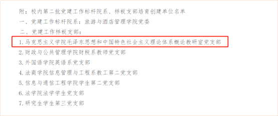 (通讯员:王海涛)近日,公司发布了校内第二批党建工作标杆院系、样板支部培育名单,公司毛泽东思想和中国特色社会主义理论体系概论教研室党支部入选。